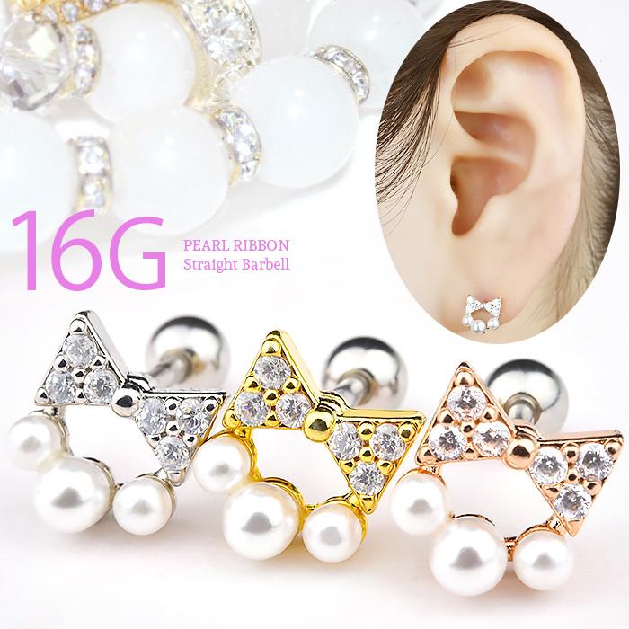 ピアス 耳たぶ 16g ボディピアス 軟骨ピアス 軟骨 可愛いピアス リボン パール 3連 耳用 イヤー ロブ 軟骨用 トラガス ヘリックス サージカルステンレス 金属アレルギー対応 シルバー ゴールド ピンクゴールド ストレートバーベル かわいい 16ゲージ ボディピアス専門店